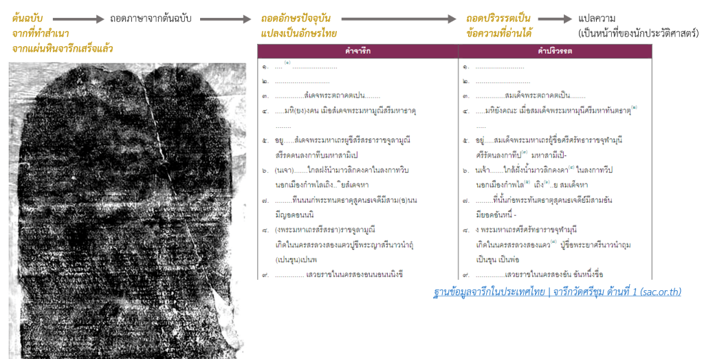 ภาพที่ 7 กระบวนการตีความแปลอักษรจากเอกสารลายลักษณ์ในทางโบราณคดี ซึ่งยกตัวอย่างจารึกวัดศรีชุม